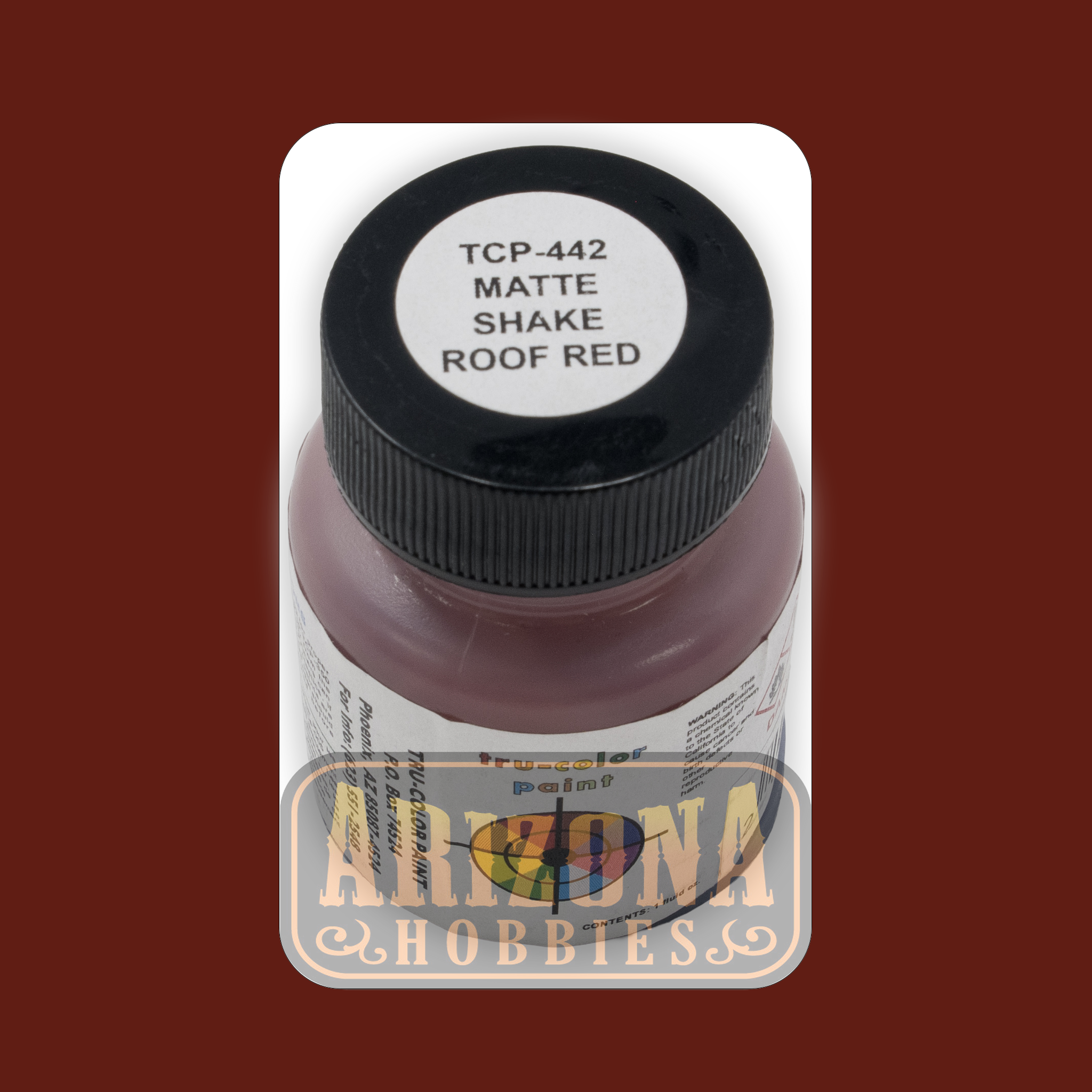 The Matte SHAKE ROOF RED is a premium airbrush-ready Tru-Color paint designed for precision applications where a matte finish is desired. This 1-oz bottle contains solvent-based acrylic paint, specially formulated to dry to a flat, matte finish, ideal for various modeling and hobby projects.