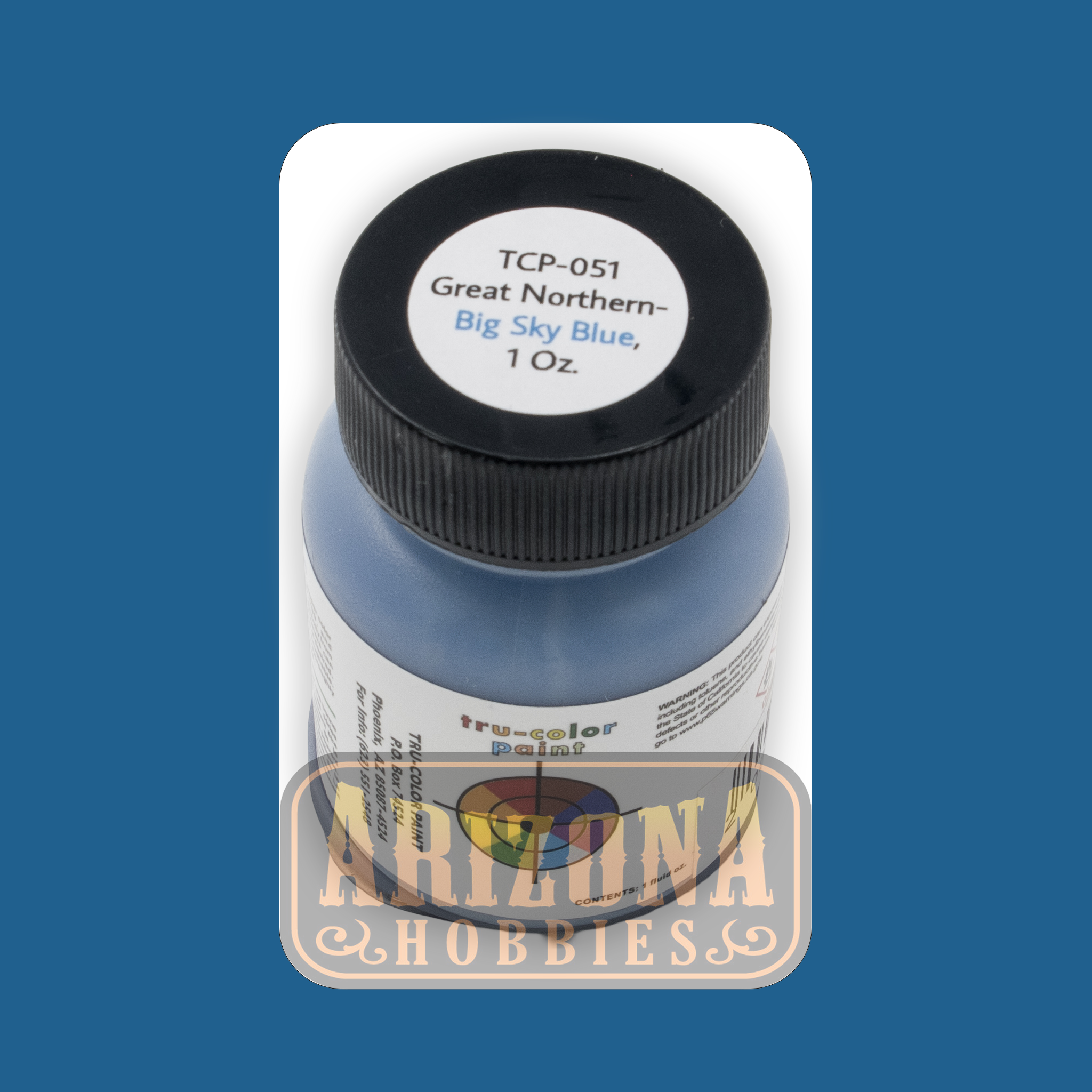 The Great Northern BIG SKY BLUE 1-oz bottle is an airbrush-ready Tru-Color paint designed specifically for precision and ease of use in detailed painting projects. This solvent-based acrylic paint is expertly thinned with acetone and other media for optimal spray performance.